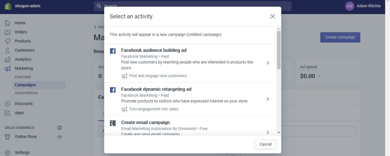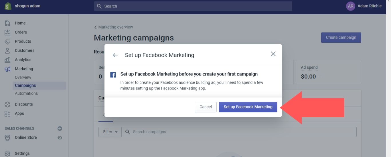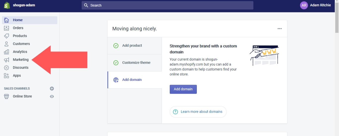 1. To set up Facebook Retargeting ads first, you’ll need to log in to your Shopify account. After you’ve logged in, select the “Marketing” option in the left sidebar of the dashboard.