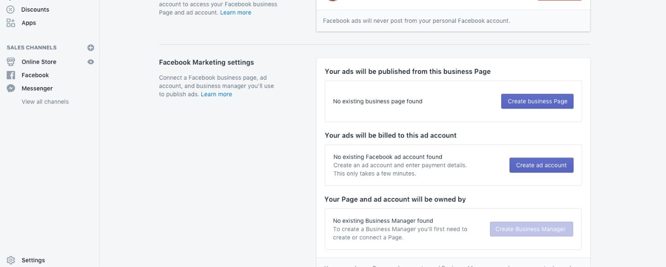 5. You’ll be directed to the Facebook Marketing admin console, which is now displayed in your Shopify dashboard’s “Apps” tab. Enter your username and password information by clicking the “Connect account” tab.