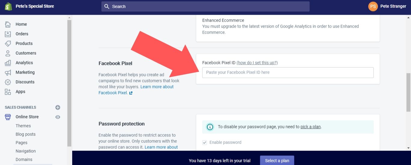 9. You can find the Pixel ID in the top-left corner tab of the new Pixel page. Add this to your clipboard and Choose “Online Store” > “Preferences” in the left sidebar of the tab after logging into your Shopify account.