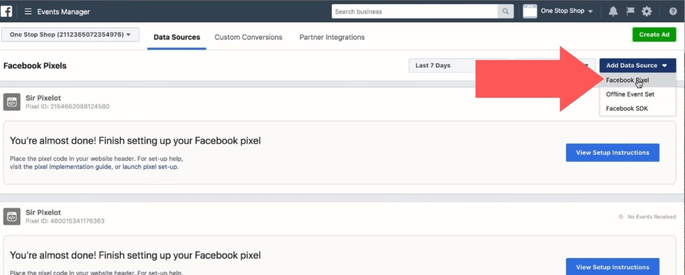 8. Choose “Facebook Pixel” from the menu bar when you Select “Add Data Source.” and Select the “Create” tab after creating your Pixel name.